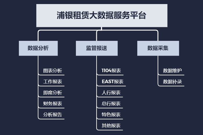 基于監(jiān)管報(bào)表生成質(zhì)量無(wú)法得到有效保證、內(nèi)外部數(shù)據(jù)的統(tǒng)計(jì)分析工作成為日常辦公基本需要、各部門對(duì)數(shù)據(jù)服務(wù)提出較高要求等問題,浦銀租賃大數(shù)據(jù)服務(wù)平臺(tái)總體設(shè)計(jì)分為數(shù)據(jù)分析、監(jiān)管報(bào)送和數(shù)據(jù)采集三大模塊。