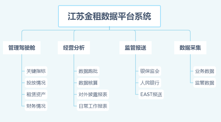 江蘇金租數(shù)據(jù)平臺系統(tǒng)目前開發(fā)完成的主要是管理駕駛艙、經營分析、監(jiān)管報送、數(shù)據(jù)采集四大模塊。系統(tǒng)業(yè)務功能架構見下圖: