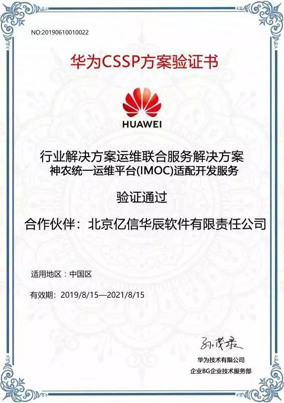 近期,億信華辰還通過華為IMOC適配開發服務的CSSP伙伴認證。這也意味著我們與華為有了更深入的合作,不僅是產品工具的合作伙伴,同時也是實施開發服務的合作伙伴,將來可以在IMOC項目中提供可視化相關的實施開發服務。