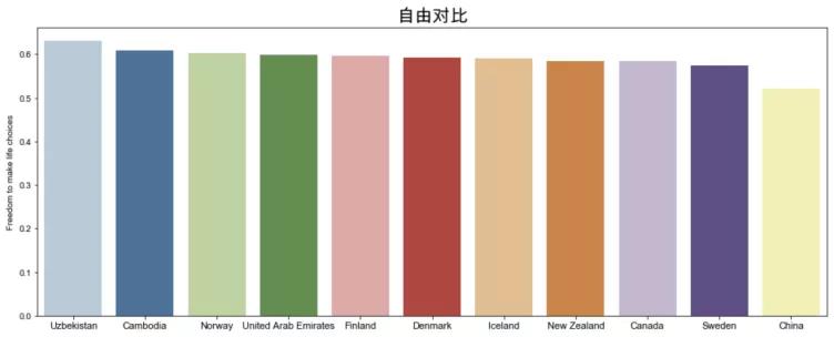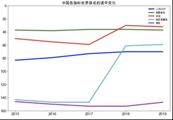 對過去五年的中國在各指數上的全球排名的變化可以發現,預期壽命基本保持不變,人均GDP緩步上升,政府清廉度急速上升,捐款狀況在低位徘徊,人民自由先降后升。可以反映出,我國的反腐斗爭成績喜人,經濟建設還需努力,民生醫療建設成果要繼續保持,為了更好的發展,我們需要更高質量的自由。
