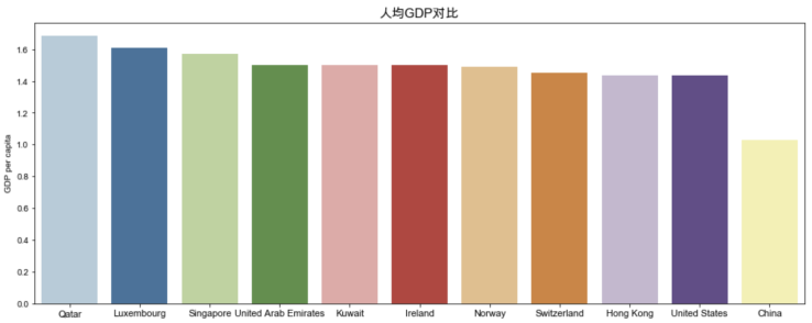 我們將中國在各指標上的得分與該指標上得分最高的十個國家進行對比,分析中國排名落后的原因。對人均GDP的分析可以發現,中國的人均GDP排名全世界第70位,據此來看,中國在發展中國家的地位是穩穩當當。