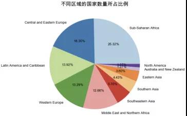 全球所有國家可分為十個區域,包括撒哈拉以南非洲、中東歐、拉丁美洲和加勒比、西歐、中東與北非、東南亞、南亞、東亞、澳大利亞和新西蘭以及北美。如圖所示,其中撒哈拉以南的國家眾多,占到總數的25%左右,大洋洲只有澳大利亞和新西蘭,而北美只包括美國和加拿大。