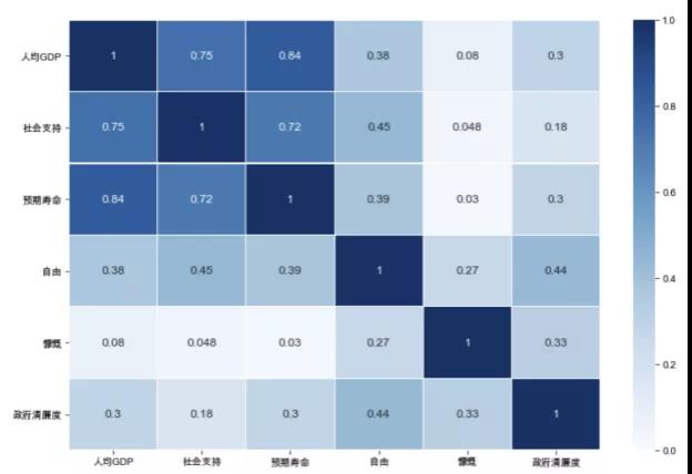 我們對合成幸福指數所用到的分數進行相關系數的計算可以發現,人均GDP與社會支持和預期壽命之間具有高相關,相應的社會支持和預期壽命也存在高相關。自由與其他因素只有中等程度的相關,而慷慨(捐款)、政府清廉度與其他因素的相關度都不高。